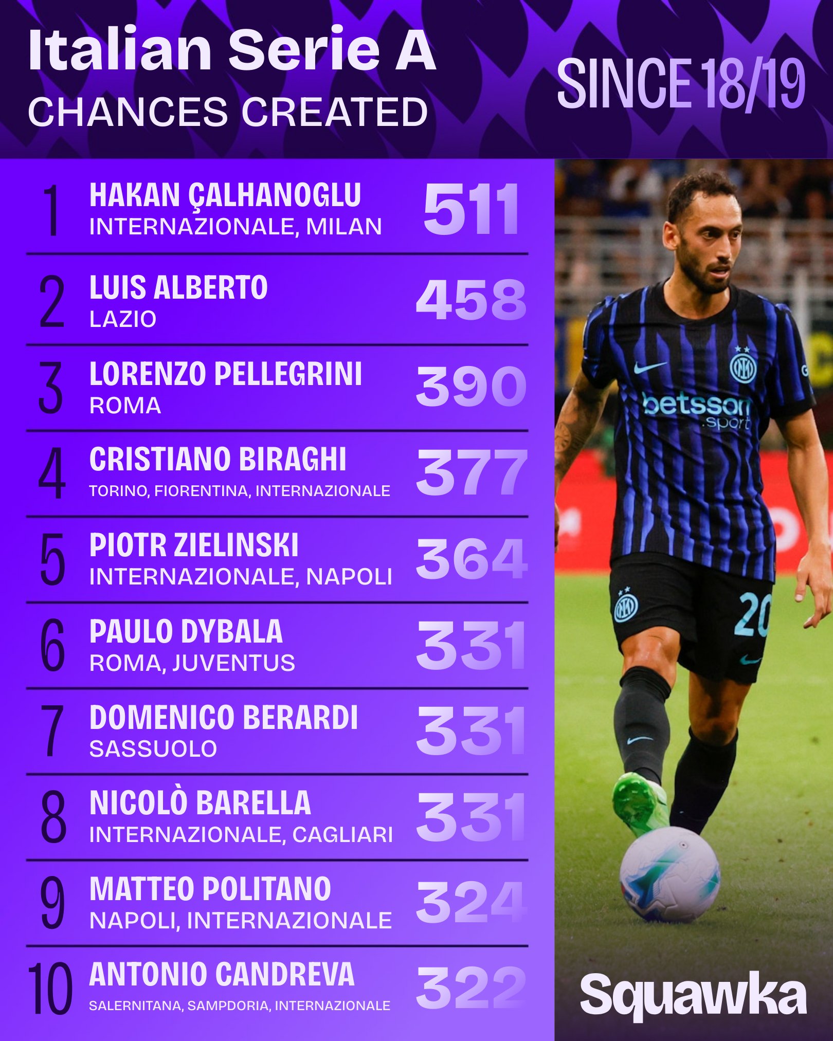 Статистический Интернет-портал Squawka опубликовал топ-10 игроков, которые за последние семь сезонов чаще всего создавали угрозу для обороны соперников. На первом месте с 511 созданными моментами находится турецкий полузащитник «Интера» Хакан Чалханоглу, за ним следует бывший «лациале» Луис Альберто с 458 моментами. Замыкает тройку лучших плеймейкеров экс-капитан «джаллоросси» Лоренцо Пеллегрини. В активе «семерки» «Ромы» - 390 голевых моментов. Пауло Дибала занимает шестое место наравне с Доменико Берарди из «Сассуоло» и Николой Бареллой из миланского «Интера» - 331 момент.